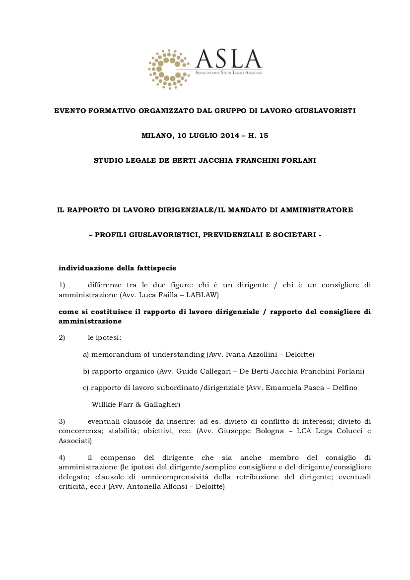 Home Desks IL RAPPORTO DI LAVORO DIRIGENZIALE/IL MANDATO DI AMMINISTRATORE - Milan, July 10th, 2014
