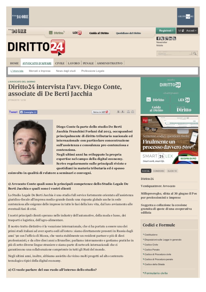 Diego Conte fa parte dello studio De Berti Jacchia Franchini Forlani dal 2013, occupandosi principalmente di diritto tributario nazionale ed internazionale con particolare concentrazione sull’assistenza e consulenza pre-contenziosa e contenziosa. Negli ultimi anni ha sviluppato la propria expertise nel campo della digital economy. Scrive regolarmente sulle principali riviste e quotidiani in materia tributaria ed è spesso coinvolto in qualità di relatore a seminari e convegni…
