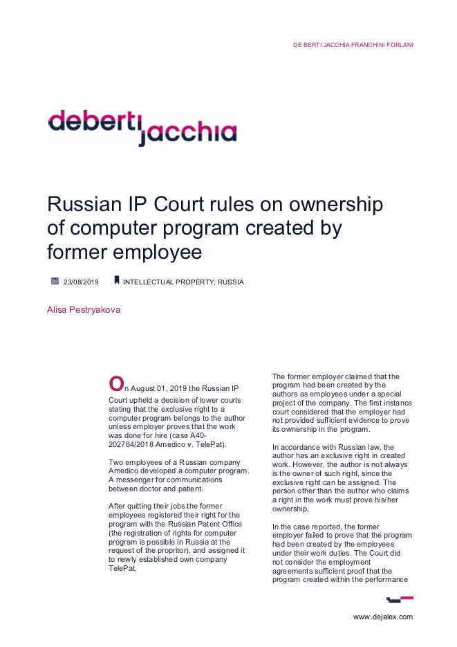 RUSSIAN IP COURT RULES ON OWNERSHIP OF COMPUTER PROGRAM CREATED BY FORMER EMPLOYEE