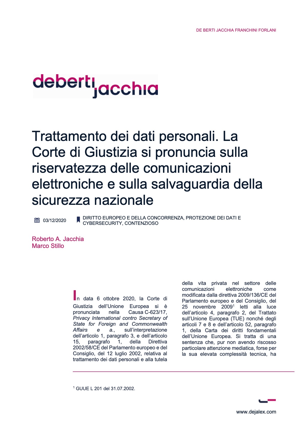 In data 6 ottobre 2020, la Corte di Giustizia dell’Unione Europea si è pronunciata nella Causa C 623/17, Privacy International contro Secretary of State for Foreign and Commonwealth Affairs e a., sull’interpretazione dell’articolo 1, paragrafo 3, e dell’articolo 15, paragrafo 1, della Direttiva 2002/58/CE del Parlamento europeo e del Consiglio, del 12 luglio 2002…